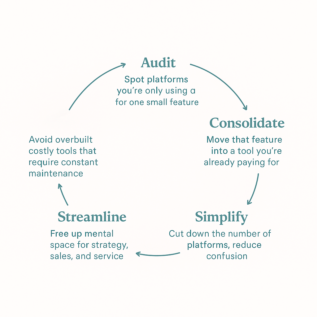 The easiest path is the simplest path. Are you using a platform just for one small feature? I had a client who wanted to keep an outdated system only for its form feature. I recommended moving the form over to Squarespace, which they were already paying for. By consolidating into one tool, we removed unnecessary confusion and cut down the list of platforms they had to manage. Simplifying for yourself has a ripple effect which makes your business run smoother and creates a simpler, clearer experience for your clients. It also frees up your mental space and energy, giving you more capacity to focus on strategy, sales, and serving your clients.